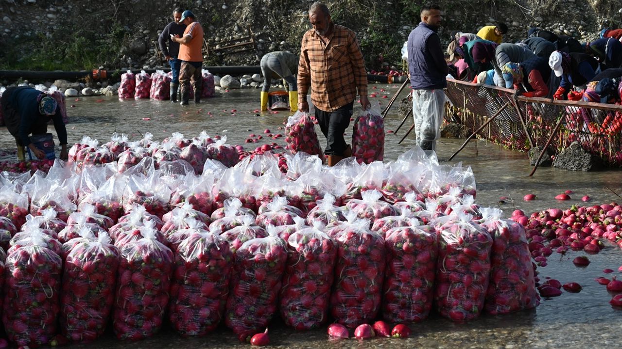 Osmaniye'de coğrafi işaret tescilli Kadirli turpunda hasada başlayan çiftçiler, tüketicilere ulaştıracakları ürünleri çamurdan arındırmak için Savrun Çayı'nın soğuk suyunda el birliğiyle çalışıyor.